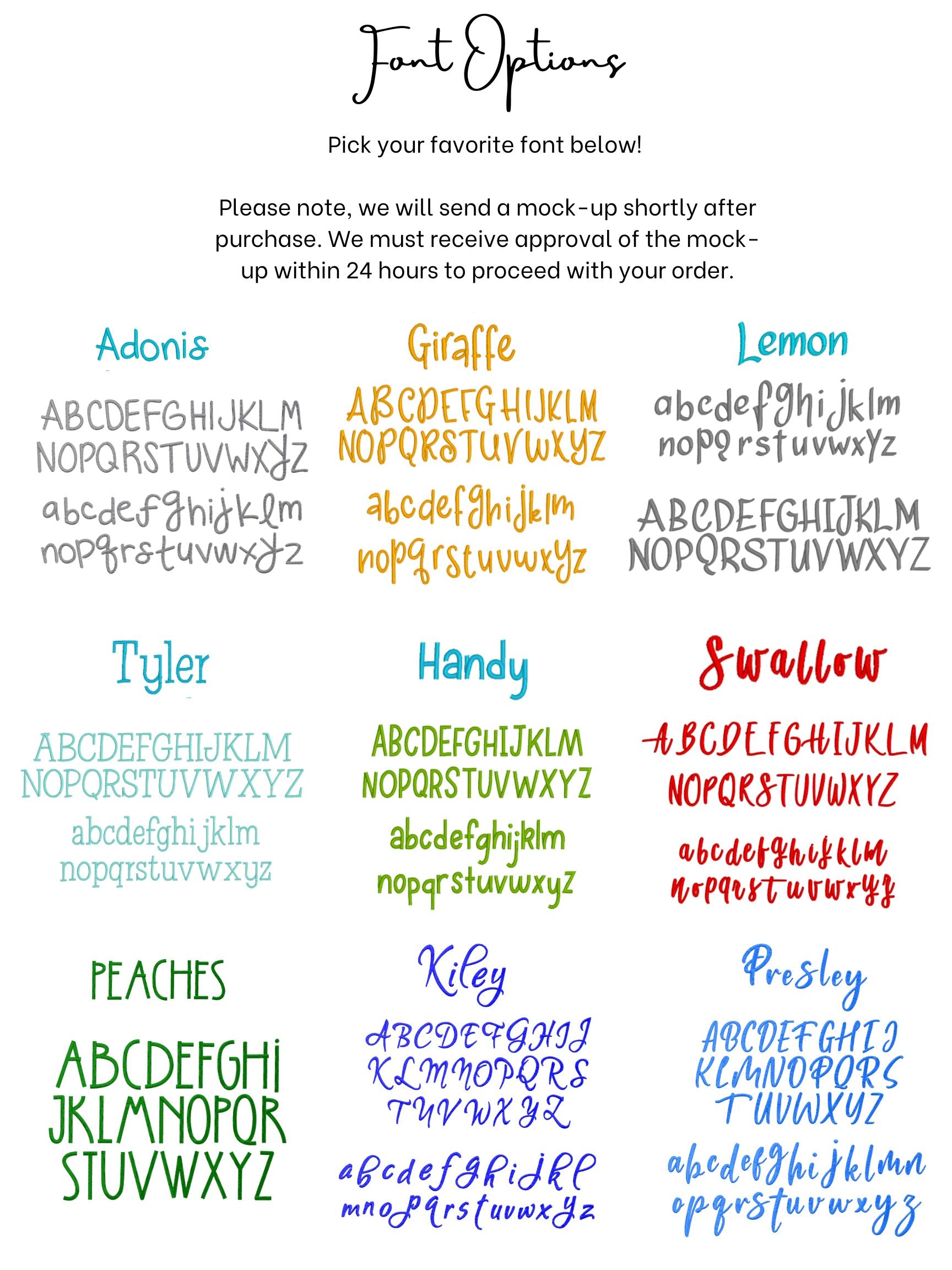 Fast shipping! Great quality!! And loved she sent a sample of the font you picked plus the other options! Highly recommend will definitely